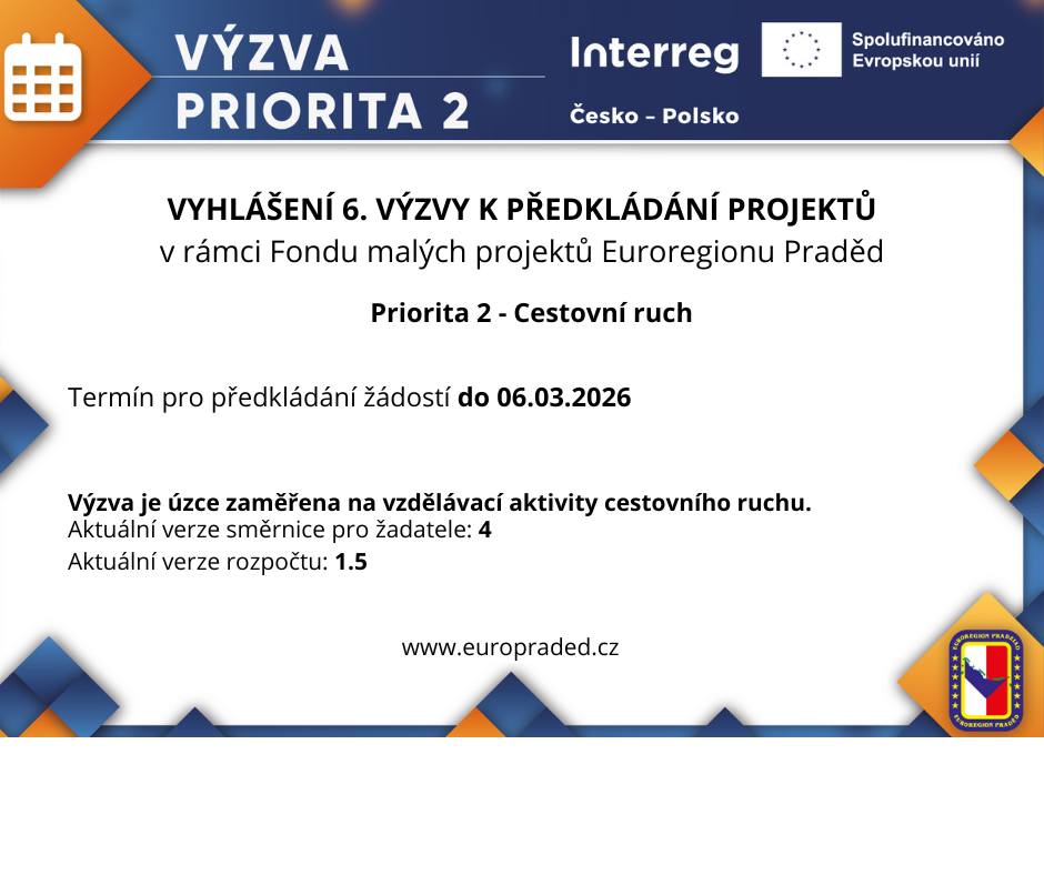 Euroregion Praděd ogłosił 6. nabór wniosków w ramach Priorytetu 2 – Turystyka! / Euroregion Praděd vyhlásil 6. výzvu k předkládání žádostí v rámci Priority 2 – Cestovní ruch!