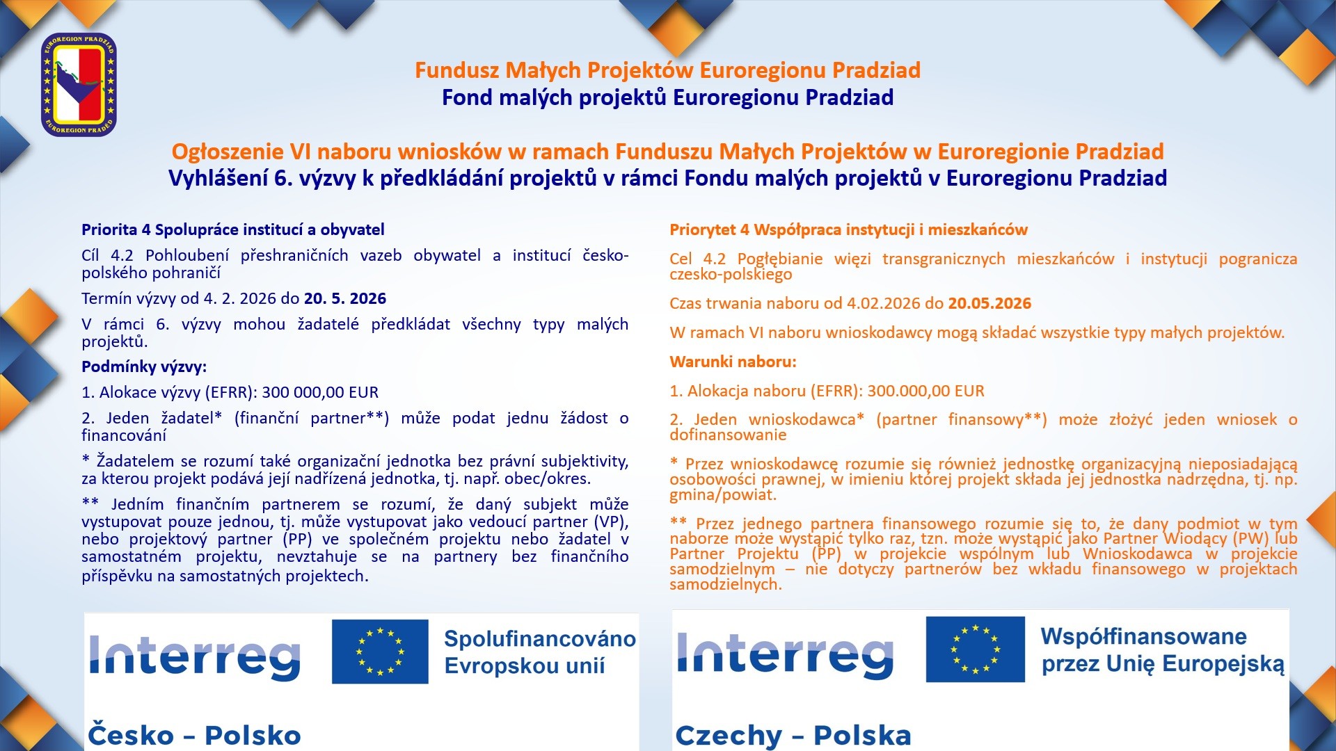 Vyhlášení 6. výzvy k předkládání projektů v rámci Fondu malých projektů v Euroregionu Pradziad