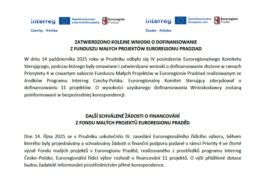 Dne 14. října 2025 se v Prudniku uskutečnilo IV. zasedání Euroregionálního řídicího výboru, během kterého byly projednávány a schvalovány žádosti o finanční podporu podané v rámci Priority 4 ve čtvrté výzvě Fondu malých projektů v Euroregionu Praděd, realizovaného z prostředků programu Interreg Česko–Polsko. Euroregionální řídicí výbor rozhodl o financování 11 projektů. O výši přidělené dotace budou žadatelé informováni prostřednictvím přímé korespondence.