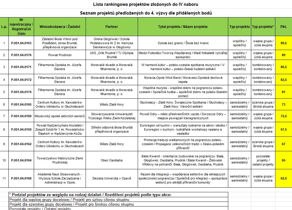 W dniu 14 października 2025 roku w Prudniku odbyło się IV posiedzenie Euroregionalnego Komitetu Sterującego, podczas którego były omawiane i zatwierdzane wnioski o dofinansowanie złożone w ramach Priorytetu 4 w czwartym naborze Funduszu Małych Projektów w Euroregionie Pradziad realizowanym ze środków Programu Interreg Czechy-Polska. Euroregionalny Komitet Sterujący zdecydował o dofinansowaniu 11 projektów. O wysokości uzyskanego dofinansowania Wnioskodawcy zostaną poinformowani w bezpośredniej korespondencji.